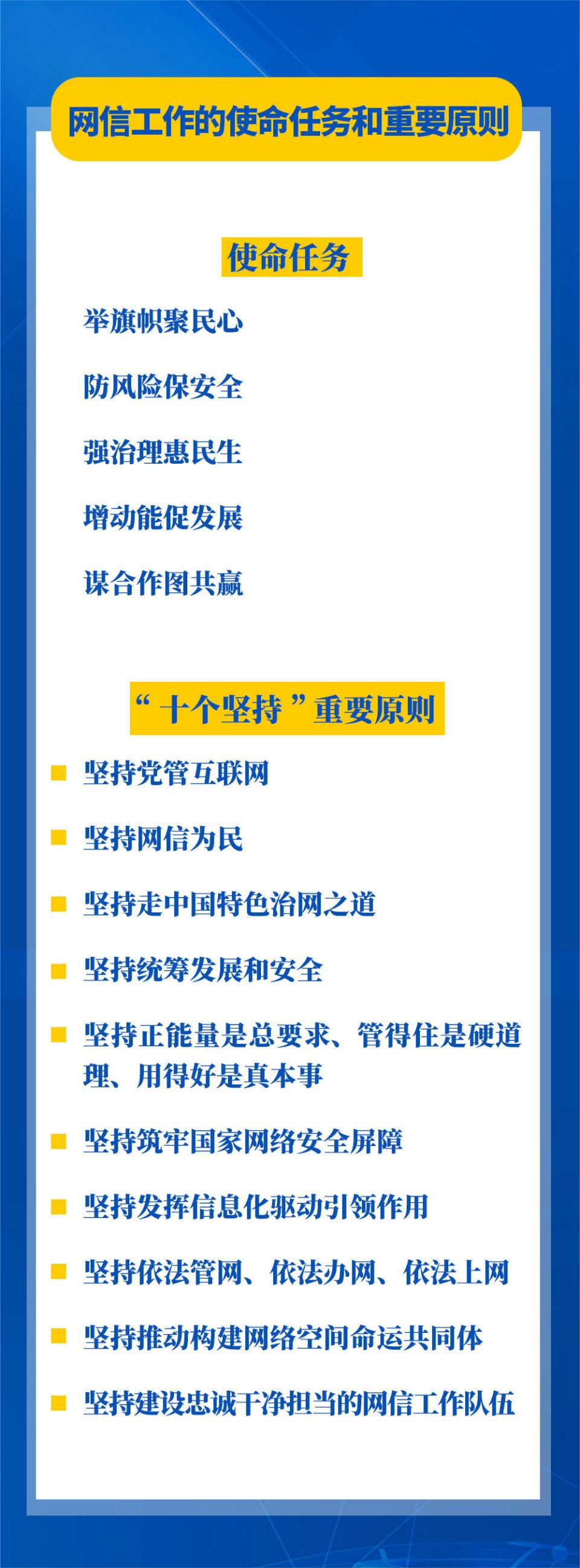 習(xí)近平總書記鮮明提出的網(wǎng)信工作“5個方面、30個字”的使命任務(wù),涵蓋互聯(lián)網(wǎng)內(nèi)容建設(shè)、網(wǎng)絡(luò)安全、網(wǎng)絡(luò)惠民、信息化建設(shè)、國際網(wǎng)絡(luò)空間治理等,“十個堅持”重要原則進(jìn)一步豐富和發(fā)展了習(xí)近平總書記關(guān)于網(wǎng)絡(luò)強(qiáng)國的重要思想,把黨對網(wǎng)信工作的規(guī)律性認(rèn)識提升到全新高度??倳浱岢龅氖姑蝿?wù)和重要原則,具有很強(qiáng)的政治性、戰(zhàn)略性、指導(dǎo)性,既著眼當(dāng)前,又謀深慮遠(yuǎn),為做好新時代新征程網(wǎng)信工作指明了前進(jìn)方向,為推進(jìn)實(shí)現(xiàn)網(wǎng)絡(luò)強(qiáng)國提供了根本遵循。