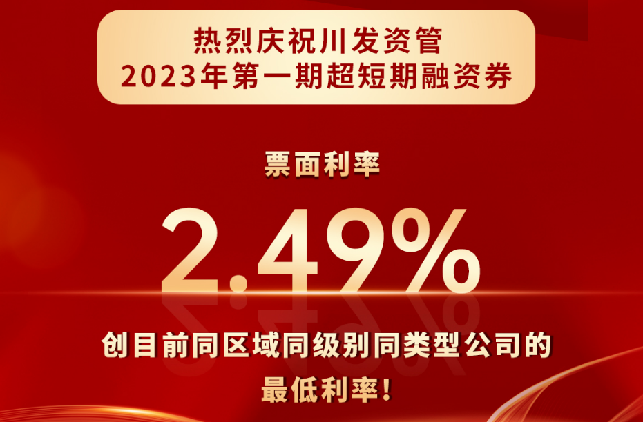 2023年7月24日,四川發(fā)展資產(chǎn)管理有限公司2023年第一期超短期融資券在北金所成功發(fā)行,發(fā)行規(guī)模3億元,期限180天,由興業(yè)銀行承銷。本期債券發(fā)行獲大量投資者關(guān)注,全場(chǎng)認(rèn)購倍數(shù)達(dá)2倍,最終取得2.49%的票面利率,為目前同區(qū)域同級(jí)別同類型公司的最低利率。