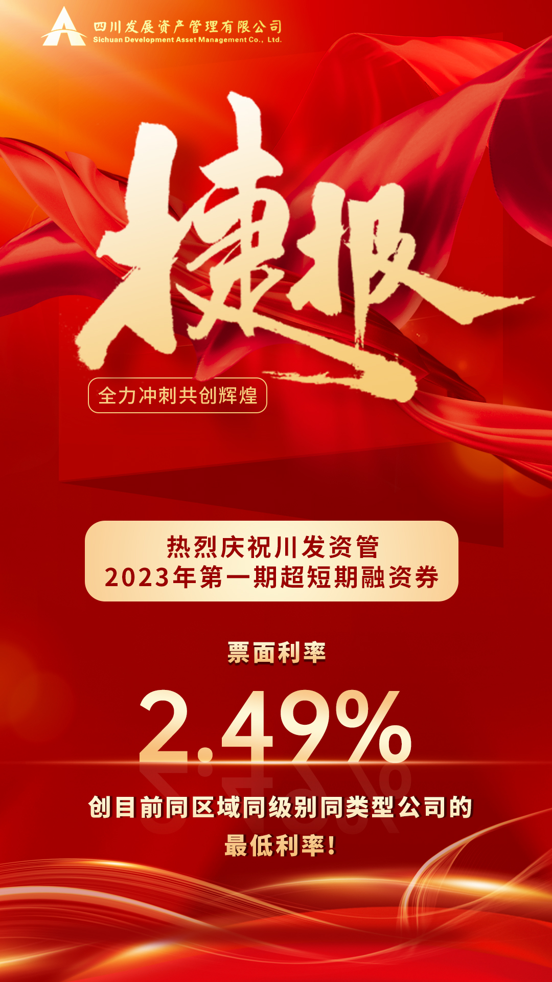 2023年7月24日,四川發(fā)展資產(chǎn)管理有限公司2023年第一期超短期融資券在北金所成功發(fā)行,發(fā)行規(guī)模3億元,期限180天,由興業(yè)銀行承銷。本期債券發(fā)行獲大量投資者關注,全場認購倍數(shù)達2倍,最終取得2.49%的票面利率,為目前同區(qū)域同級別同類型公司的最低利率。